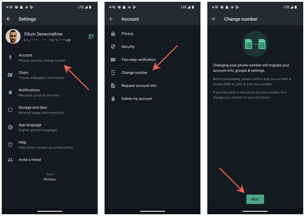WhatsApp 内置的更改号码工具让您可以非常方便地切换注册的电话号码。它会保留您的 WhatsApp 聊天记录、通话记录和设置,甚至会自动通知 WhatsApp 群聊和联系人有关号码更改的信息。请务必将 SIM 卡插入手机(如果尚未插入),因为您必须通过短信验证新号码。