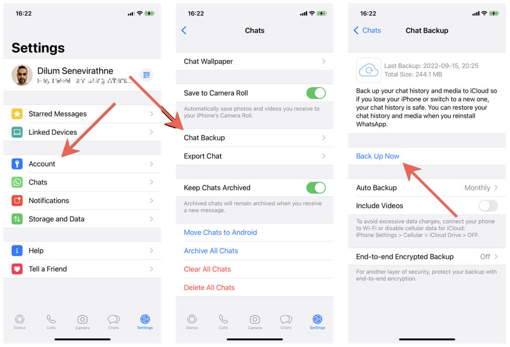- 前往设置>聊天记录>聊天备份并点击立即备份将您的信息备份到 iCloud (iOS) 或 Google Drive (Android)。请务必打开旁边的开关包括视频如果您想将 WhatsApp 视频附件传输到新手机。
