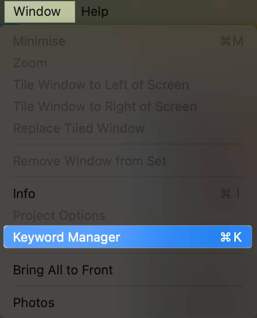 您可以在关键字管理器中查看、添加和删除关键字。选择窗户在菜单栏中并选择关键词管理器。