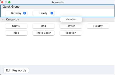 您还可以将底部列表中的关键字添加到快群区域在顶部。这使您可以使用您设置的快捷方式快速用关键字标记照片。照片还将这些关键字放置在过滤器中(如下所述),并在您分配关键字时将它们作为建议提供。