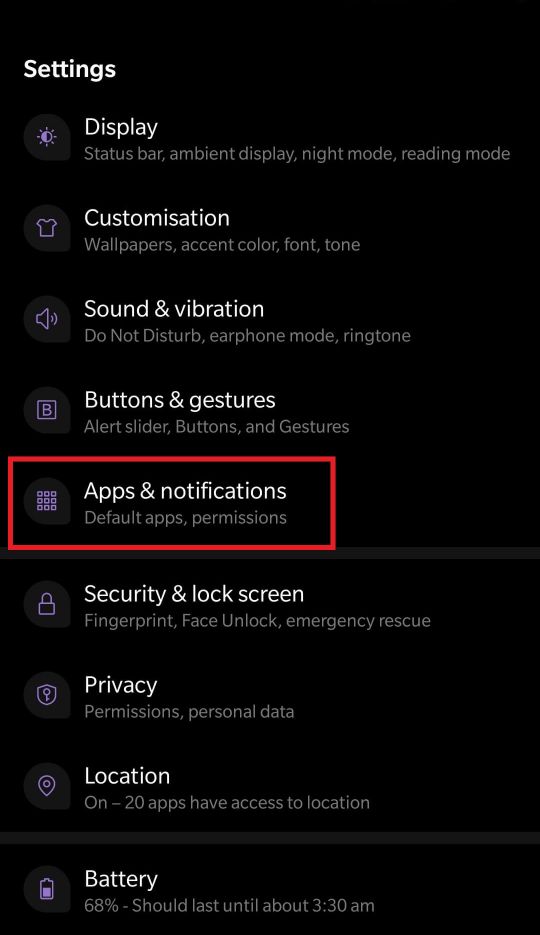 步骤一:打开设置您的 Android 智能手机的 并单击应用程序、应用程序和通知或应用程序选项。