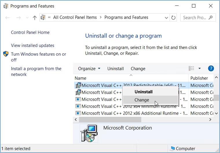 步骤2:右键单击“Microsoft Visual C++”目录并选择“更改”。