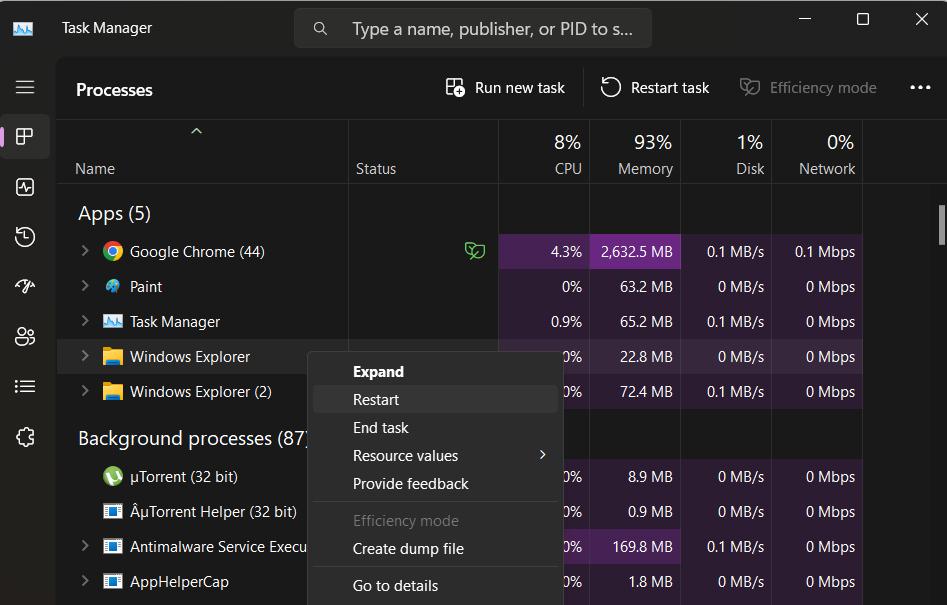 步骤3:在列表中查找“Windows 资源管理器”应用程序。右键单击它并选择“重新启动”。