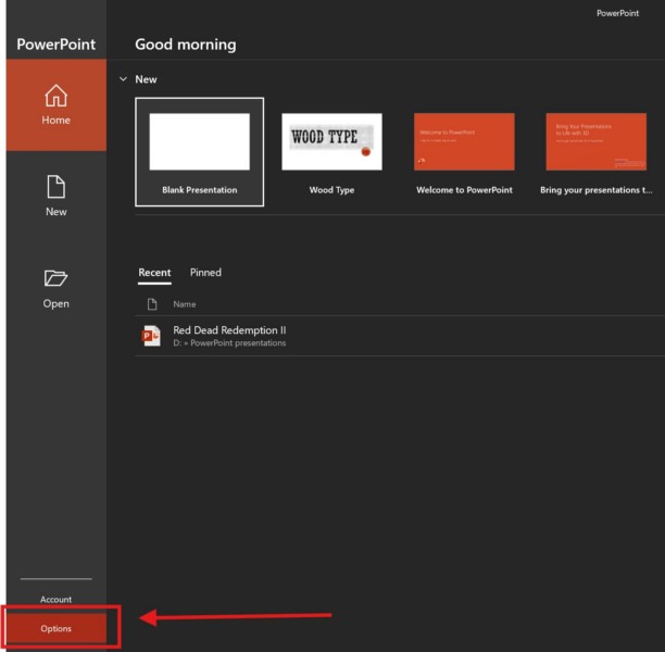 1.在应用程序的主页上,单击选项按钮在左侧导航窗格中。