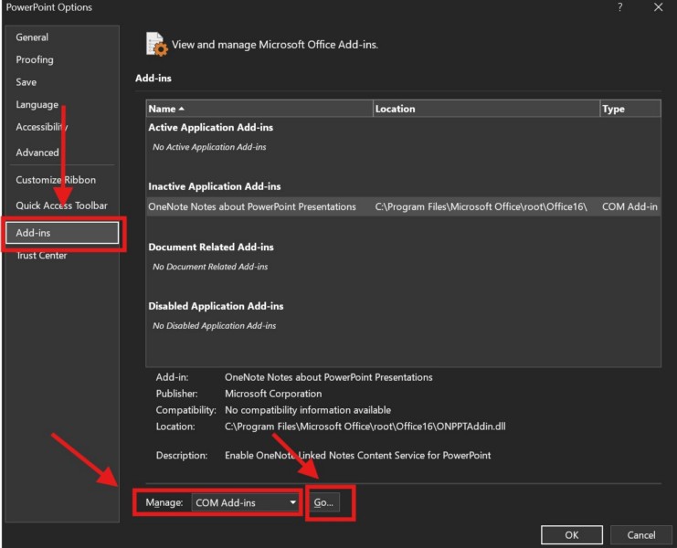 2.在以下窗口中,转到加载项选项卡在左侧导航栏中,确保管理 选项设置为COM 插件,然后点击前往...按钮就在它旁边。