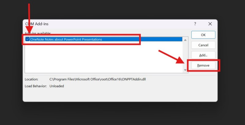 3.现在,单击可用加载项的复选框并单击删除按钮将其从所选应用程序中删除。