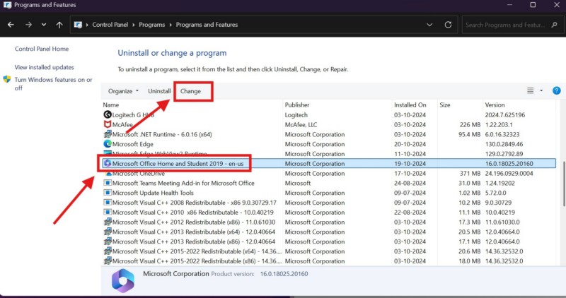 4.找到Microsoft Office应用程序在下面的列表中,左键单击以选择它,然后点击更改按钮从上面。