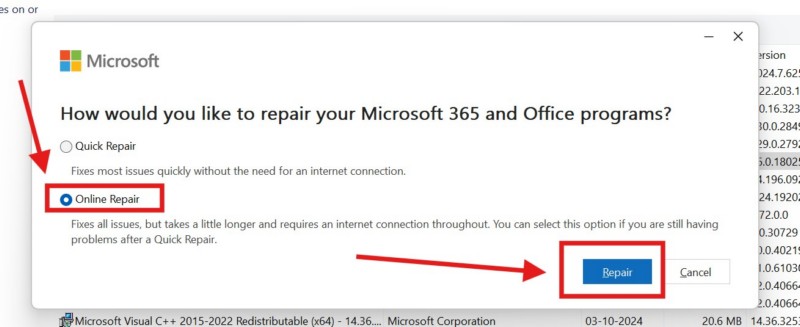 4. 在 Windows 11 上对 Microsoft 365 应用程序执行在线修复