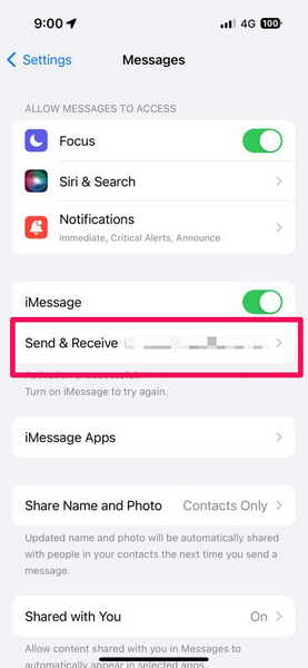 您可以在 iPhone 上打开 iMessage 设置页面,通过“发送和接收”菜单注销与其关联的 Apple ID,然后使用连接到 iPhone 上 iCloud 的主 Apple ID 登录。
