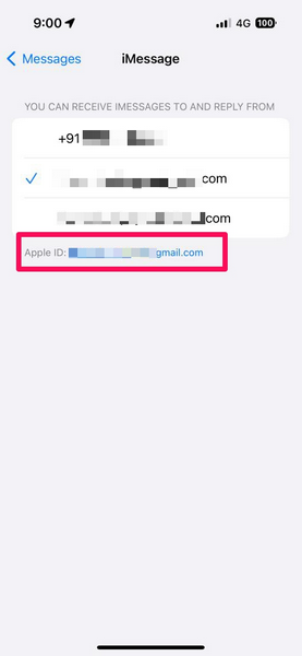 7.但是,在列表下方,您将查找您当前用于登录 iMessage 的 Apple ID在您的设备上。这应该与用于登录 iCloud 的主 Apple ID 不同。