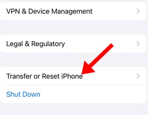步骤3:在“常规”设置中,选择“传输”或“重置 iPhone”。