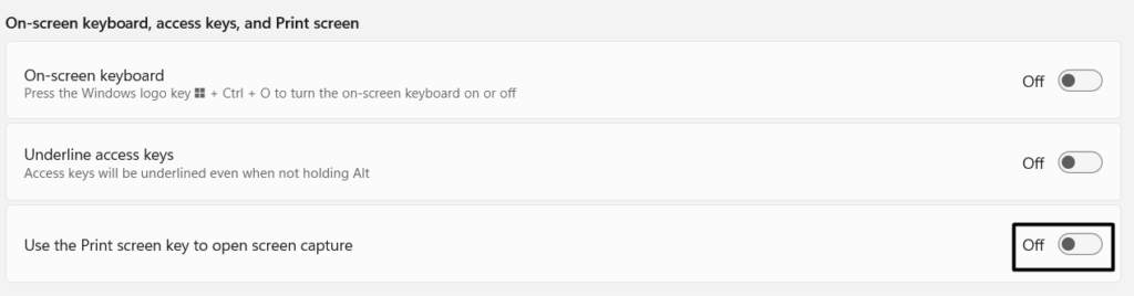 6. 关闭使用打印屏幕打开屏幕捕获选项