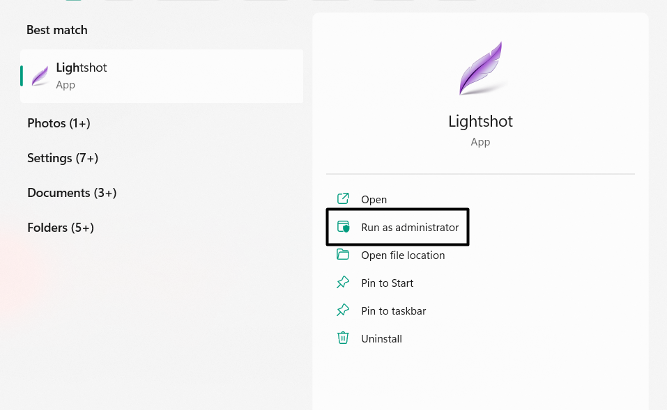 2. 以管理员身份运行 Lightshot 应用程序
