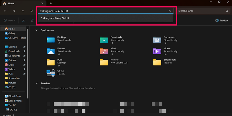 5. 输入或复制粘贴以下路径就上述文件资源管理器中的 URL 栏然后按 Enter 键找到 G Hub 应用程序: