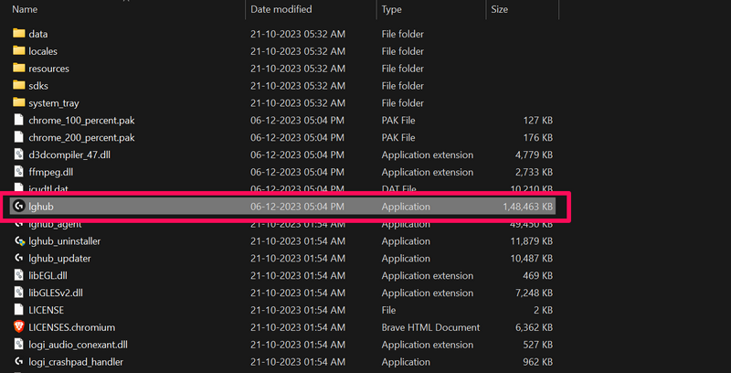 6.现在,双击 lghub(应用程序)文件在列表中启动 Windows 11 PC 或笔记本电脑上的 G Hub 程序。