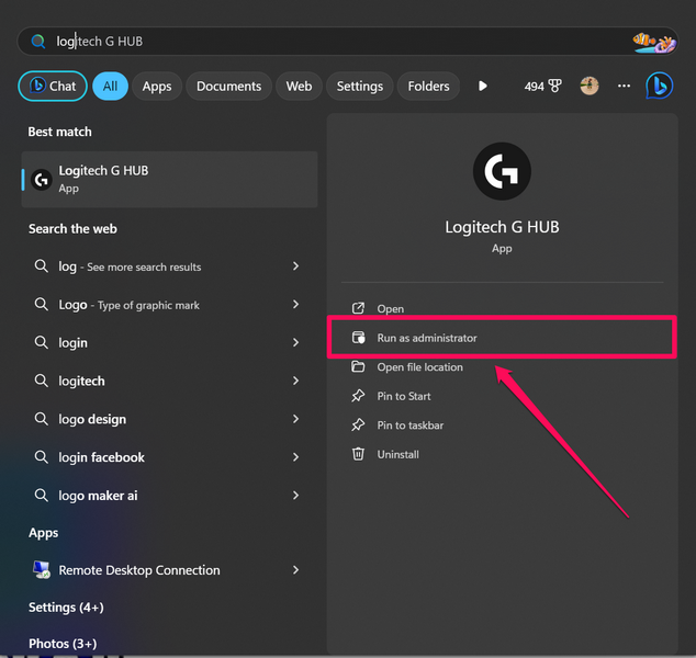 3. 尝试在 Windows 11 上以管理员身份运行 Logitech G Hub
