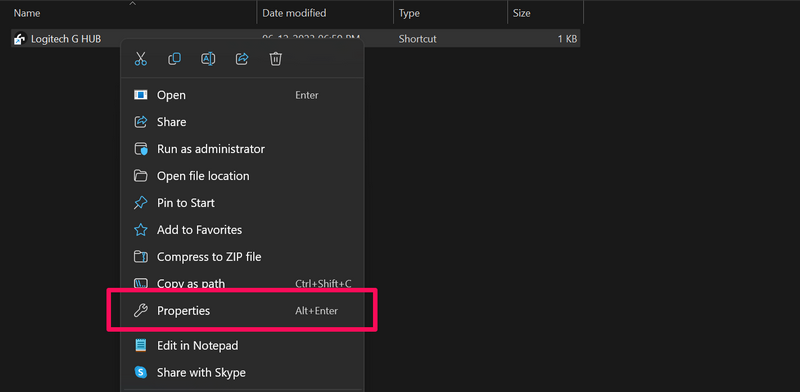 3.现在,右键单击 Logitech G Hub 快捷方式并选择特性上下文菜单上的选项。
