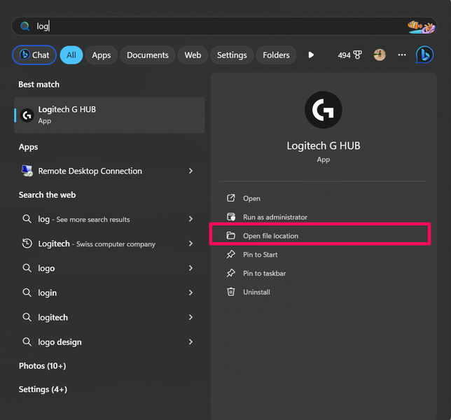 笔记:如果您将 Logitech G Hub 应用程序安装在 C 驱动器以外的其他驱动器上,则可以使用文件资源管理器中的搜索栏找到它。