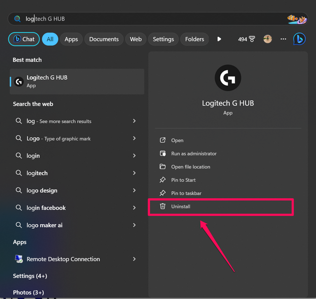 现在,如果上述所有方法都无法解决 Windows 11 PC 或笔记本电脑上的 Logitech G Hub 无法工作的问题,您现在可以尝试在设备上重新安装该程序。为此,您需要从 PC 或笔记本电脑上卸载 G Hub 应用程序,然后重新安装。