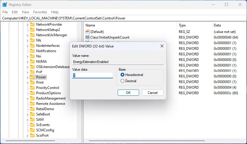 第7步:双击能量估计启用并将值数据更改为 1。单击“确定”。