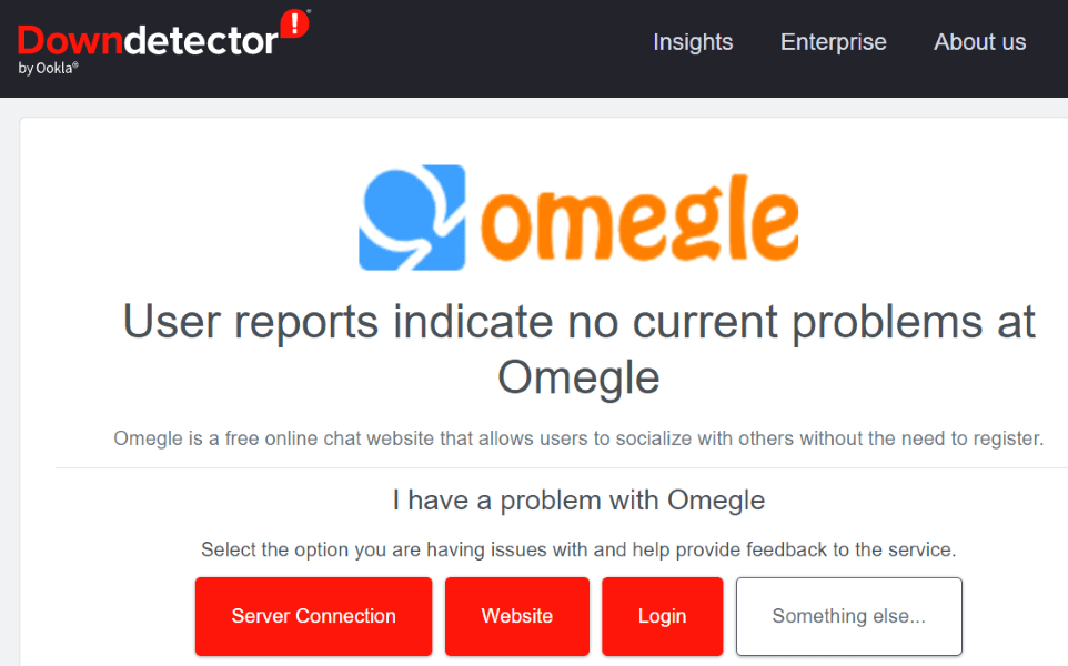 您可以使用在线工具检查网站是否已关闭,例如下探测器。该站点会告诉您 Omegle 是否遇到服务器问题。如果是这种情况,您必须等到公司解决问题并恢复网站。