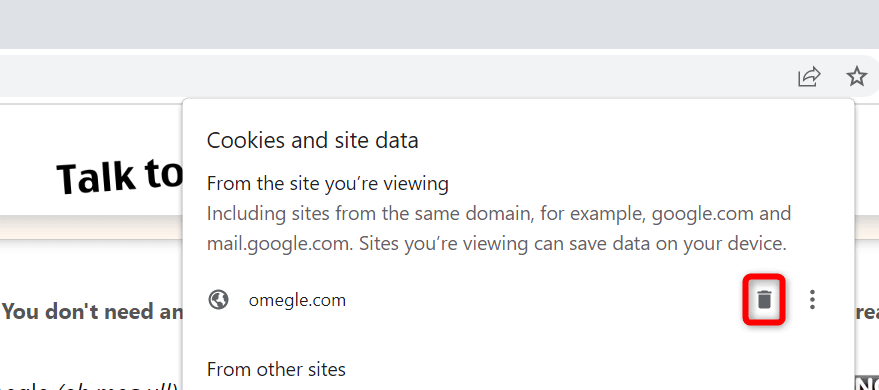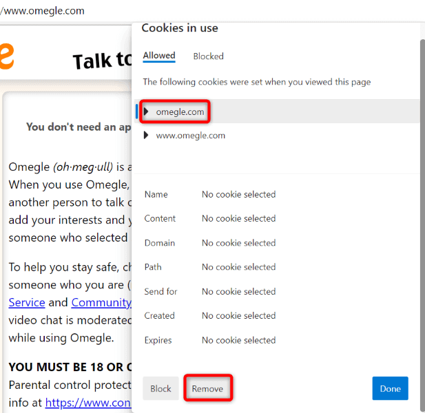 解决此问题的一种方法是在网络浏览器中清除 Omegle 的 cookie。这样做会删除 Omegle 在您的浏览器中设置的个人偏好设置,从而允许网站放置新的 cookie。