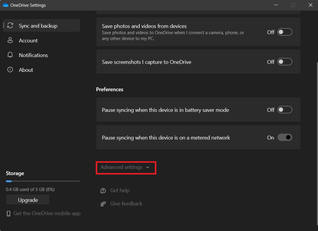 配置错误的设置也可能是 OneDrive 不同步文件的原因。 OneDrive 为用户提供了许多同步功能,例如选择特定文件夹或文件以及同步时间选择。对于笔记本电脑用户,OneDrive 还提供了在系统使用电池时暂停同步的选项。现在,文件同步取决于您在 OneDrive 应用程序中选择的选项或您选择的设置。