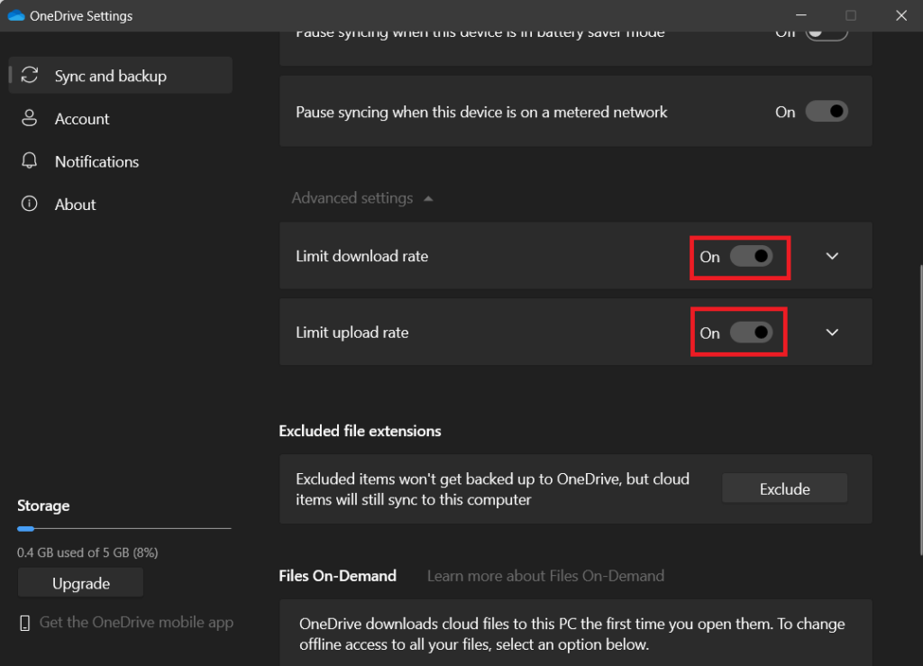 但如果您使用上传和下载限制功能并将同步过程限制在一定速度,您就可以享受游戏而不会遇到任何网络延迟。但是,如果您不玩游戏或使用任何其他带宽密集型应用程序,请禁用此限制并允许 OneDrive 更快地同步您的文件。