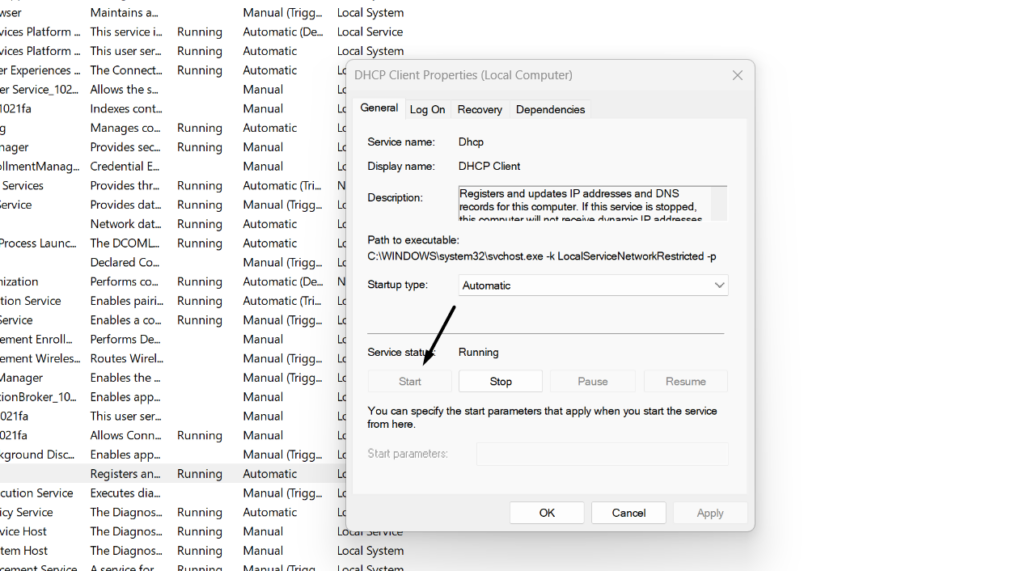 此外,依赖它的组件将无法工作。所以,这对于你的情况可能是一样的。所以,确保 DHCP 客户端服务正常工作。您可以按照以下过程进行检查: