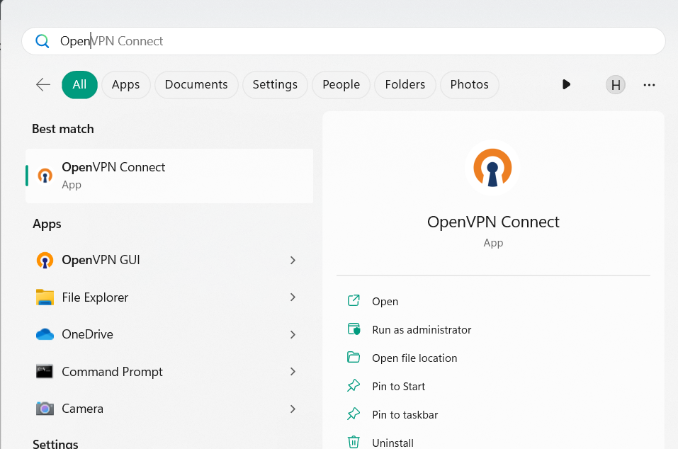 2.在Windows 搜索框, 类型开放VPN并选择以管理员身份运行从它。