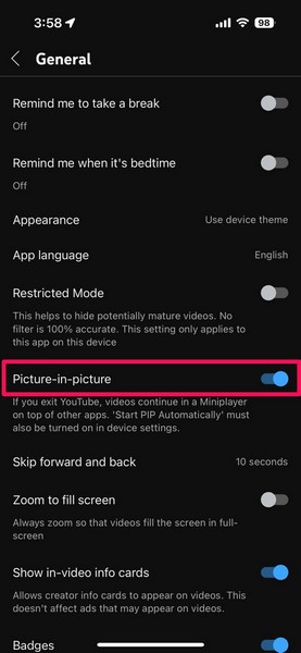 2. 确保在 YouTube 应用程序中启用画中画 (PiP)