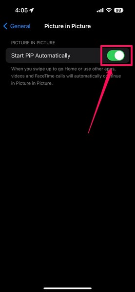 4.在这里,点击开关自动启动画中画选项启用它适用于 iOS 设备上的系统和第三方应用程序。这将确保当您退出正在播放视频的应用程序时,画中画模式会自动启动。
