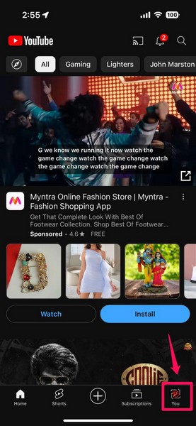 1. 打开 YouTube 应用在您的 iPhone 上和点击个人资料选项卡在底部菜单栏上。