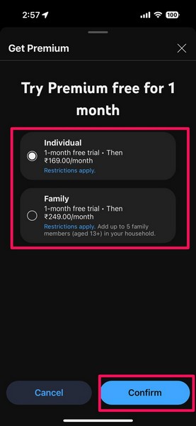 4.下一个,选择您首选的 YouTube Premium 套餐并点击确认按钮。对于个人和家庭计划,您将免费获得第一个月之后,会员资格将自动续订,直至取消。