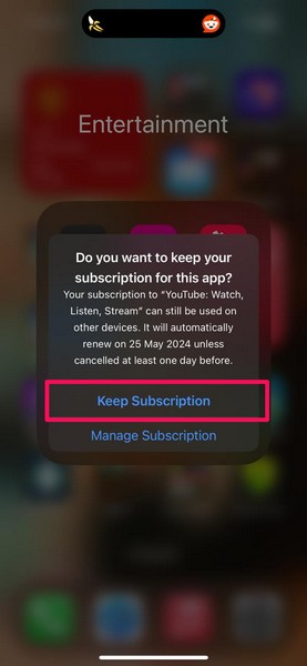 5.现在,YouTube 会询问您是否要保留您的 Premium 订阅或在 iOS 订阅设置中对其进行管理。点击保持订阅 选项。