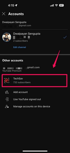 因此,如果您发现您在 YouTube 应用中使用常规 Google 帐户并尝试访问画中画 (PiP) 模式,您可以按照以下步骤切换到正确的帐户: