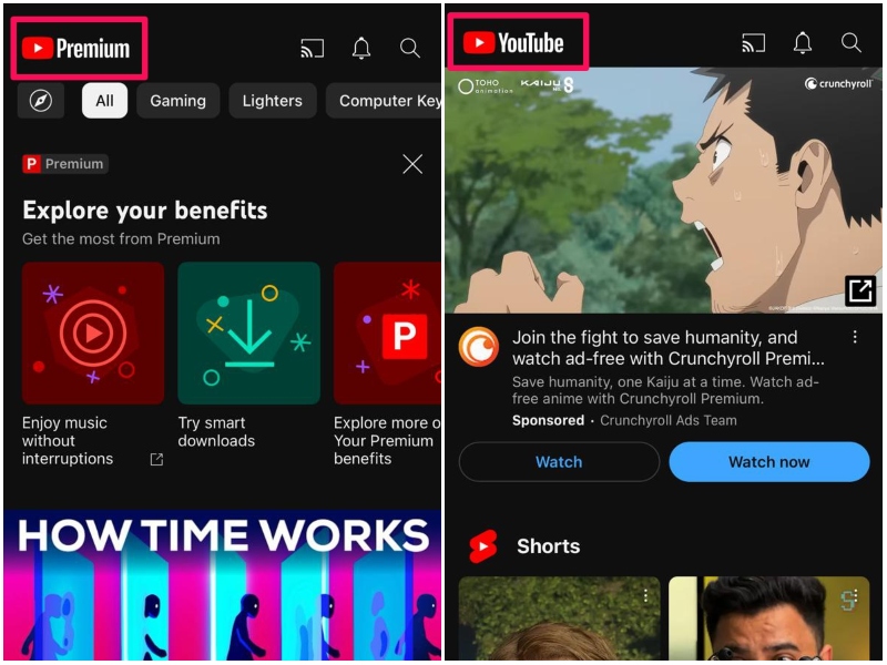 如果您在 iPhone 上使用与订阅 YouTube Premium 套餐相同的 Google 帐户,您应该会在应用程序中看到“Premium”标题,而不是通常的“YouTube”标题。但是,对于非高级帐户,您将看到标准的“YouTube”标签。