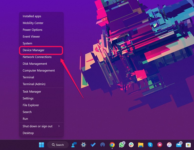 1.使用 Windows + X 打开快速链接菜单并选择设备管理器选项从列表中。