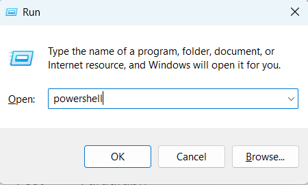 1.打开运行实用程序使用Windows + R快捷键和类型电源外壳在搜索框中。