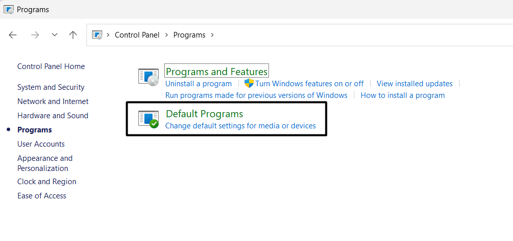 2。在程序窗口,选择默认程序然后选择以下选项: