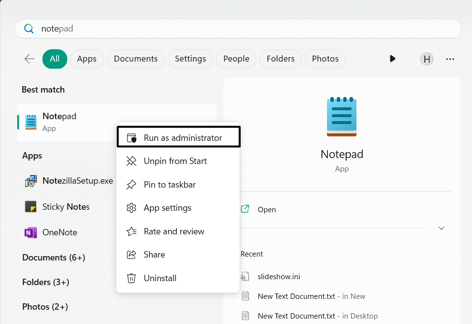 1。打开记事本应用在您的PC上具有管理权,然后单击文件在顶部菜单中。