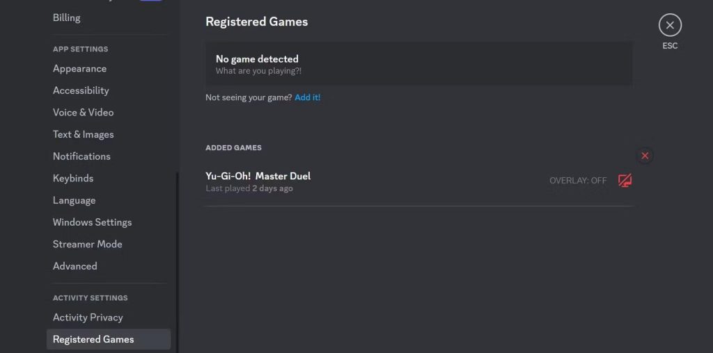 您需要确保 Discord 覆盖正常运行的三件事:覆盖功能已打开,您正在玩的游戏已添加到注册游戏列表中,并且该游戏的覆盖设置未关闭。因此,在完成其他修复之前,请确保基本覆盖配置正确。请按照以下措施检查设置: