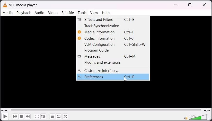 在 Windows 11 PC 上启动 VLC Player 应用程序。点击顶部菜单栏上的“工具”选项,然后选择“首选项”。