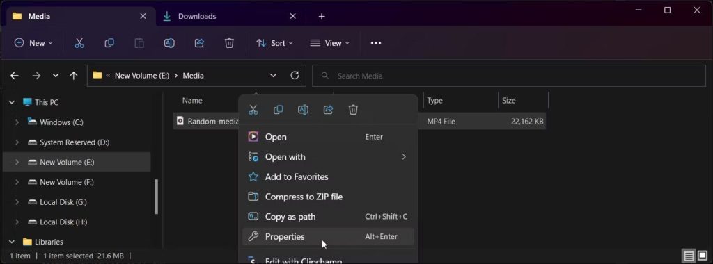启动文件资源管理器应用程序并导航到存储媒体文件的位置。右键单击该文件并选择“属性”。