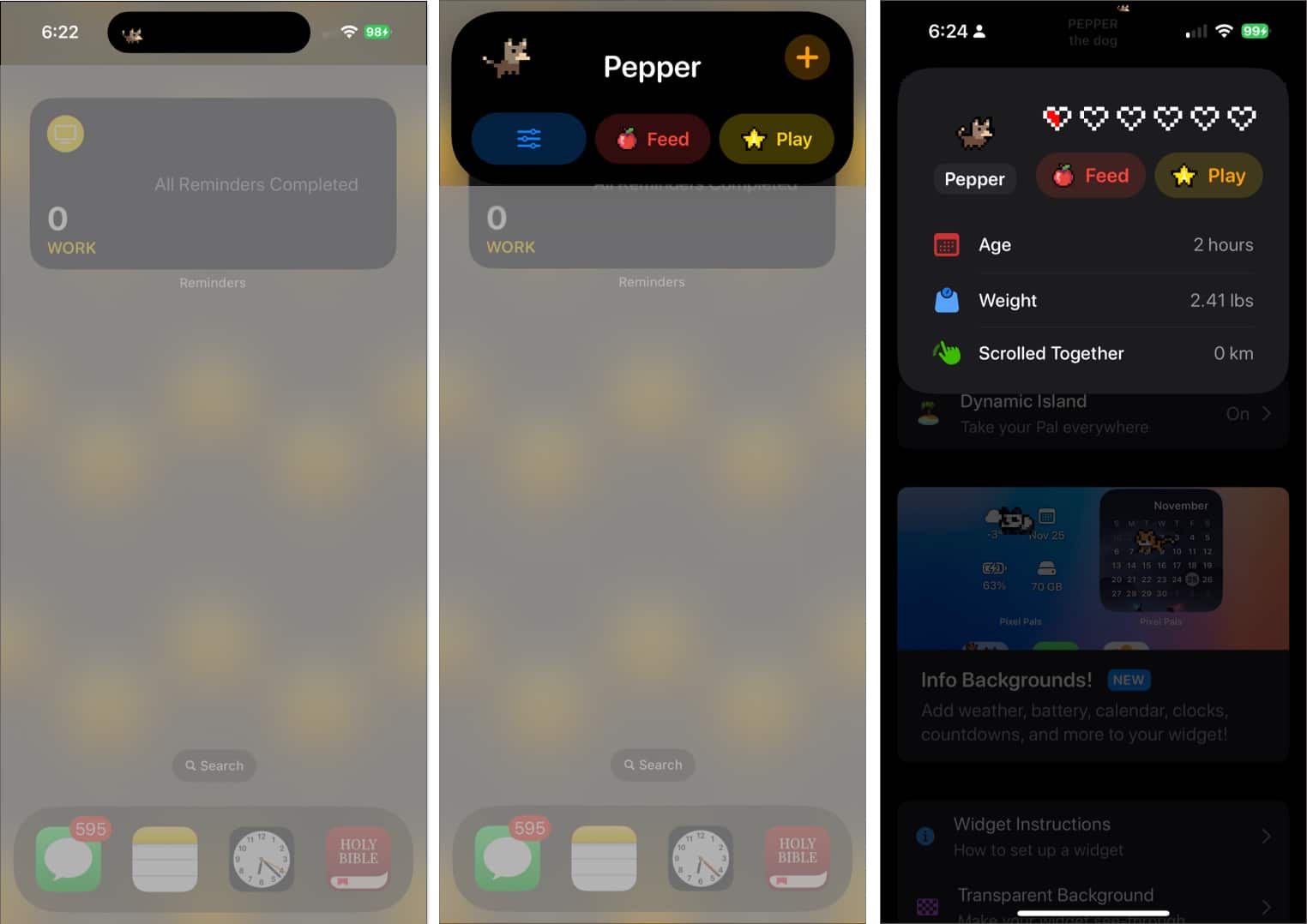 这可以让你点击任何地方,但所有选项都会将你重定向到主应用程序。当应用程序打开时,在动态岛上点击您的宠物,您可以看到宠物的年龄、体重以及你们一起滚动的总距离(当然,作为您的数字滚动伴侣!)
