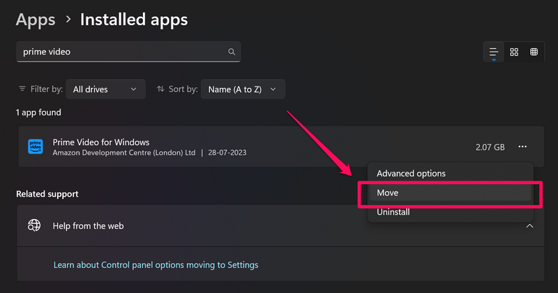7.接下来,单击下面的框选择将此应用程序移动到的驱动器选项和选择首选驱动器将 Prime Video 应用程序存储在 Windows 11 电脑或笔记本电脑上。