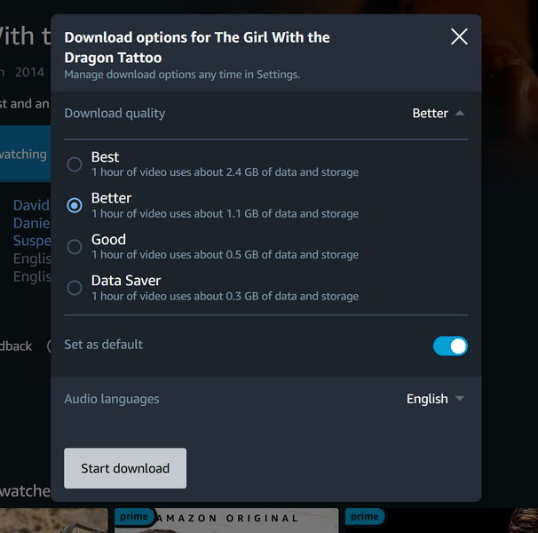 5.您还可以启用以下功能的切换设置为默认选项让 Prime Video 应用程序知道您喜欢的质量以供将来下载。