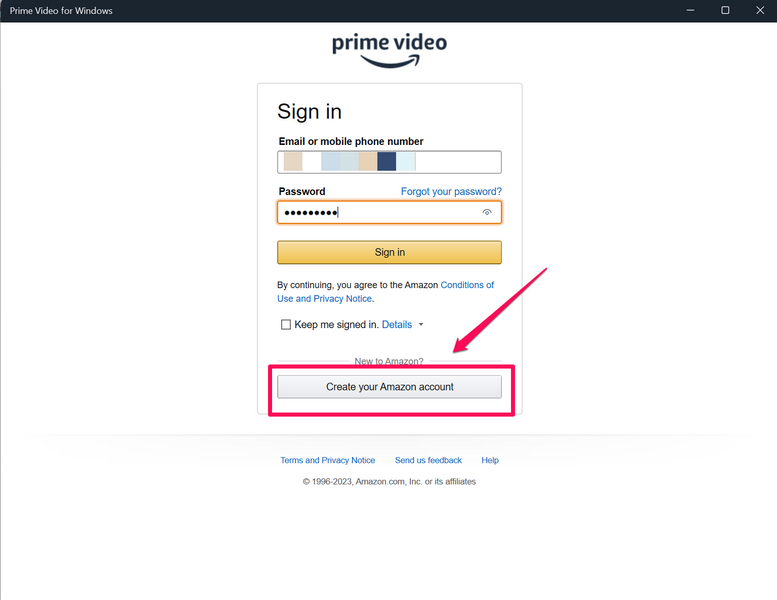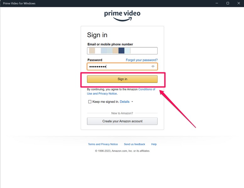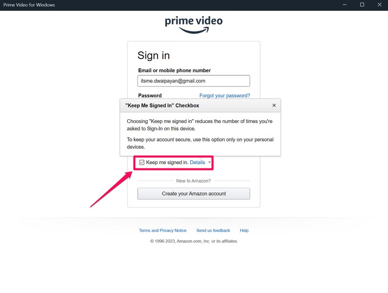 3.在下一页上,提供您的亚马逊账户凭据登录。如果您没有亚马逊帐户,请点击创建您的亚马逊帐户选项,按照屏幕上的说明进行操作,并且订阅 Prime 视频继续它。