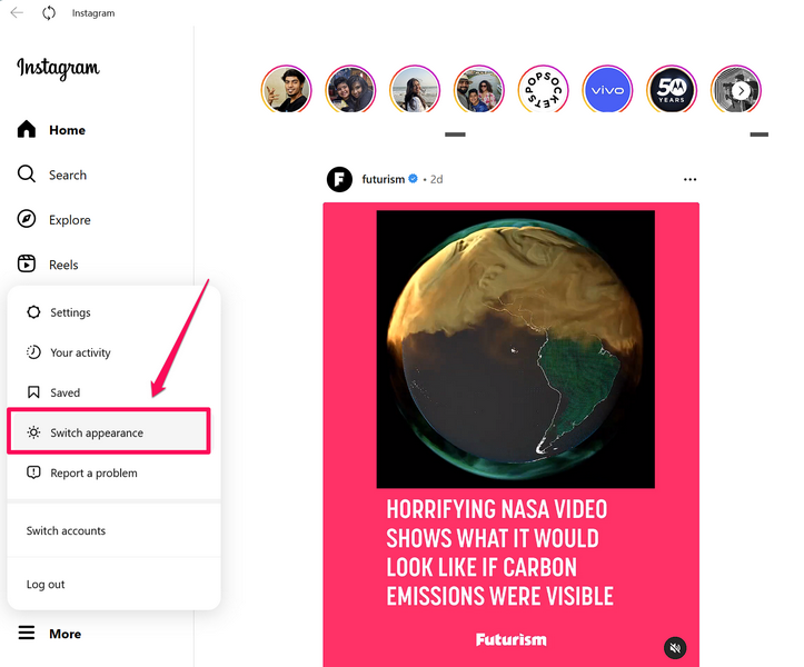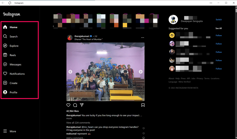 在 Windows 11 PC 或笔记本电脑上登录 Instagram 帐户后,您会发现自己位于主页上,用户的所有帖子和故事都在您的关注列表中。