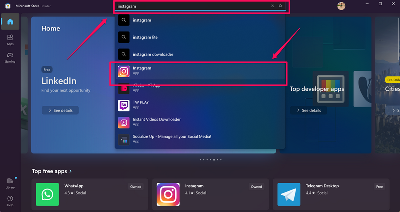 2.使用搜索栏上方在 Microsoft Store 中寻找Instagram.